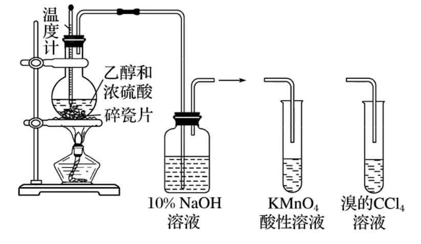 溶液除杂:通过导管的不仅有乙烯,还有挥发出来的乙醇,同时浓硫酸发生碳化,碳与浓硫酸再次反应,产生二氧化硫杂质,浓硫酸有强氧化性,生成 杂质。因此,不能将其不经除杂直接通入 或 溴水 中验证乙烯具有还原性,乙醇和 会使前者褪色, 会使后者褪色